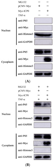 As there is a direct interaction between ICP0 and p65 (Figure 4), and endogenous p65 levels are affected by ICP0 (Figure 3), we can infer that the nucleus p65 decrease in non-TNF-α/MG132-treated cells is related to the degradation effect of ICP0 on p65. In contrast, in TNF-α/MG132-treated cells, compared with the empty-vector-transfected group, in the ICP0-transfected group, most of the p65 protein remained in the cytoplasm, and only a small amount of p65 entered the nucleus (Figure 6). These results further confirmed that ICP0 could inhibit the nuclear translocation of ICP0. In addition, results in Figure 3 and Figure 5 also indicated that ICP0 could inhibit the phosphorylation level of IκBα and p65 when cells were treated with TNF-α or TNF-α combined with MG132. So, the different results in Figure 6A,B may be due to the inhibitory effect of ICP0 on phosphorylation of IκBα or p65.