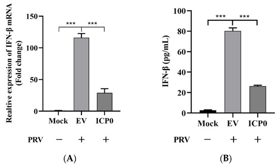 In Figure 1, we demonstrate that ICP0 expression enhances PRV replication in PK15 cells, but it is unclear whether this observation is due to the attenuation of cytokine production via NF-κB suppression shown in the above results. As it is well known that NF-κB regulates IFN-β production, we then detected IFN-β expression in empty-vector- or ICP0-transfected cells during PRV infection. Results indicated that ICP0 could abrogate IFN-β mRNA transcription compared to the empty vector group in the condition of viral infection (Figure 7A). ELISA was also used to quantify IFN-β secretion expression. As shown in Figure 7B, ICP0 significantly inhibited antiviral factor IFN-β production. These results demonstrated that ICP0 overexpression could block IFN-β production. Furthermore, the increase in PRV proliferation caused by ICP0 was related to the decrease in antiviral factor IFN-β production.