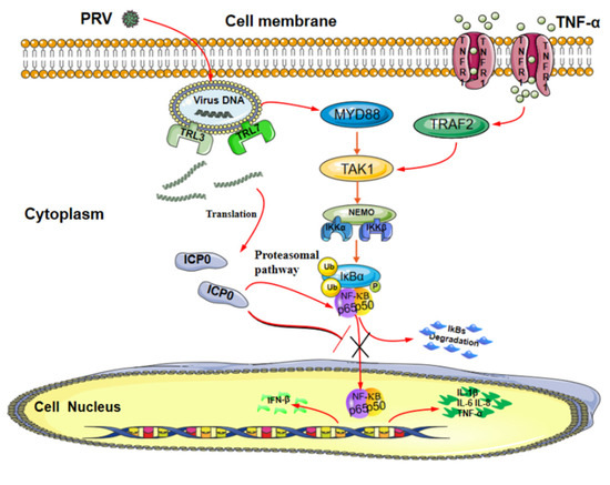PRV uses numerous viral proteins to antagonize the host innate immune system. Previous studies showed that PRV UL24 had an inhibitory role in the NF-κB pathway [21]. In this study, we proved that PRV ICP0 had a similar effect to UL24 in the inhibition of the NF-κB pathway. Using Western blot analysis, we identified p65 as a target of the PRV ICP0 protein, through which it inhibits TNF-α-mediated activation of the NF-κB signaling pathway (Figure 3).
