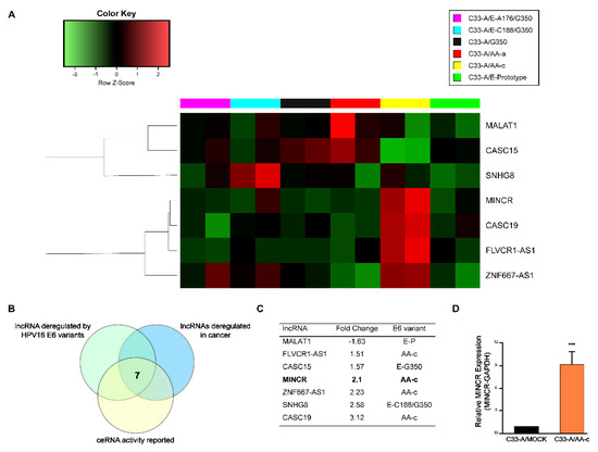 The AA-c variant alters the expression of MINCR and other lncRNAs with activity as a ceRNA. (A) Heat map illustrating that lncRNAs are differentially expressed in C33-A cells expressing HPV16 variants. (B,C) lncRNAs filtered after applying the selection criteria; (D) MINCR expression in C33-A/AA-c cells determined by RT-qPCR. Relative expression was normalized to the GAPDH gene. Student’s t-test, *** p < 0.001.