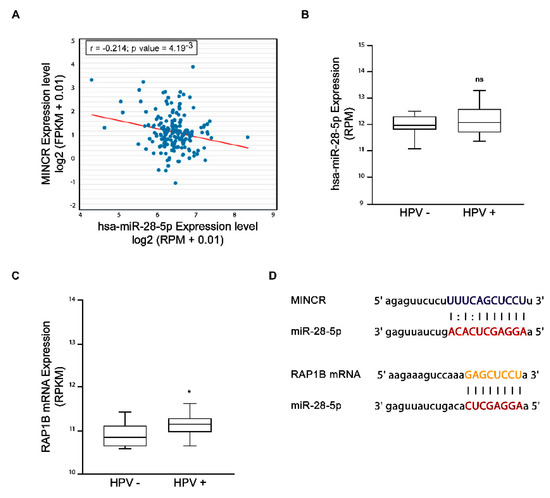 To identify the possible axis of interaction of MINCR with miRNA and its target messenger, a bioinformatic analysis was performed using the StarBase database for the construction of the interaction axis of lncRNAs–miRNAs–mRNA. The results show 12 miRNAs with a potential role in the interaction with MINCR (Table S1). miRNA sets were analyzed in several tumor samples obtained from the TCGA database to correlate their expression levels with the levels of MINCR. A negative correlation between the expression of MINCR and miR-28-5p in patients with pancreatic adenocarcinoma was found, suggesting the role of MINCR as a ceRNA for miR-28-5p (Figure 2A). Subsequently, prediction of the target genes of miR-28-5p was performed using the TargetScan, miRDB, and miRTarBase databases. The results show three genes coincident in the three platforms (Table S2); among them, the RAP1B gene has a role in carcinogenesis due to its participation in cellular processes such as cell migration and invasion. Direct interaction between RAP1B mRNA and miR-28-5p has already been demonstrated in endometrial cancer cells [16]. In order to evaluate whether the MINCR/miR-28-5p/RAP1B interaction axis might be altered during HPV16-induced carcinogenesis (Figure 2B,C), TCGA data were used to verify the miR-28-5p and RAP1B expression levels in patients CC-positive for HPV16 and were compared to patients negative for the virus. RAP1B levels were significantly higher in those patients with HPV16 infection, but no significant differences were found in the expression levels of miR-28-5p. These results suggest that other mechanisms might regulate the abundance of the RAP1B protein in addition to miR-28-5p. Additionally, it should be considered that the data used came from clinical samples with a highly heterogeneous composition, including the presence of HPV16 variants. Subsequently, the TargetScanHuman 7.1 platform was used to search for the miR-28-5p binding sites in MINCR and RAP1B mRNA. Interestingly, a similar sequence was found in both transcripts (Figure 2D), which could suggest a competition between MINCR and RAP1B mRNA for binding to miR-28-5p.
