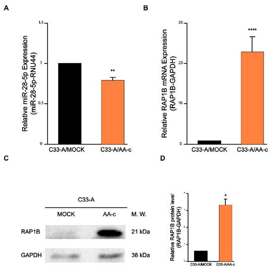Expression of miR-28-5p and RAP1B in C33-A/AA-c cells. (A,B) RT-qPCR was used to measure the level of miR-28-5p and RAP1B mRNA in C33-A/AA-c cells compared to control cells. The relative expression was normalized with the small nucleolar RNA RNU44 and GAPDH, respectively. (C) RAP1B protein level measured by Western blot. The relative levels of RAP1B obtained with respect to GAPDH protein levels were used as an endogenous control. (D) Densitometry analysis is shown. Student’s t-test * p ≤ 0.05, ** p < 0.01, **** p < 0.0001.