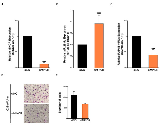 To demonstrate that MINCR regulates RAP1B expression through miR-28-5p, MINCR knockdown through siRNAs was performed in C33-A/AA-c cells (Figure 4A). The expression of miR-28-5p and RAP1B mRNA was determined by RT-qPCR after silencing MINCR. As expected, after MINCR knockdown, the expression of miR-28-5p increased 90% compared to the siRNA negative control, while the expression of RAP1B mRNA decreased 60% (Figure 4B,C). These results strongly suggest that MINCR acts as a ceRNA to inhibit the activity of miR-28-5p on its target RAP1B. Finally, to investigate whether MINCR regulates cell migration through miR-28-5p on C33-A/AA-c cells, transwell migration assays were performed. The results show that MINCR knockdown suppressed the cell migration of C33-A/AA-c cells by almost 50% (Figure 4D,E). These results indicate that the MINCR/miR-28-5p/RAP1B axis might have an important role in cervical carcinogenesis in the presence of the HPV16 variant AA-c, mainly by promoting cell migration.