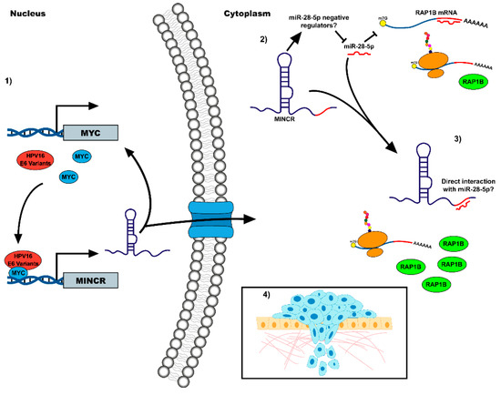 Schematic model of the mechanisms of the HPV16 oncoprotein E6 on the MINCR/miR-28-5p/RAP1B axis. (1) Through its interaction with the transcription factor MYC, the oncoprotein E6 activates the expression of MYC target genes, including MINCR. The expression of the HPV16 E6 oncoprotein variants in a cervical cancer model induces overexpression of MINCR, which is involved in the control of the MYC transcriptional network, thus generating a positive feedback between both genes. (2) In the cytoplasm, MINCR inhibits miR-28-5p activity on RAP1B mRNA through some possible mechanisms: the direct interaction of MINCR with the miRNA or the activation of negative regulators of miR-28-5p. (3) A reduction in the activity of miR-28-5p on its target mRNAs allows an increase in RAP1B mRNA and protein. (4) RAP1B overexpression promotes cell migration in cervical cancer cells.