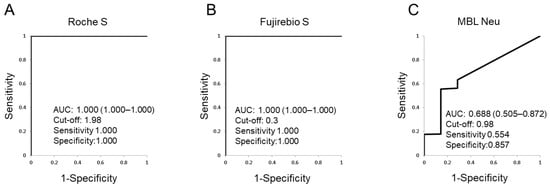 ROC analyses were performed for the SARS-CoV-2 Ab assays and AUC values were calculated (Figure 1). The AUC value for Roche S and Fujirebio S was 1.000 (95%CI 1.000–1.000) for both, whereas the AUC value for MBL Neu was 0.688 (95%CI 0.505–0.872). The optimized cut-off value of Roche S was 1.98, which is higher than set by manufacturer, whereas for Fujirebio S it was 0.3, lower than set by manufacturer. The optimized cut-off value of MBL Neu was 0.98%, lower than set based on the 98th percentile among the 52 pre-pandemic healthy subjects.