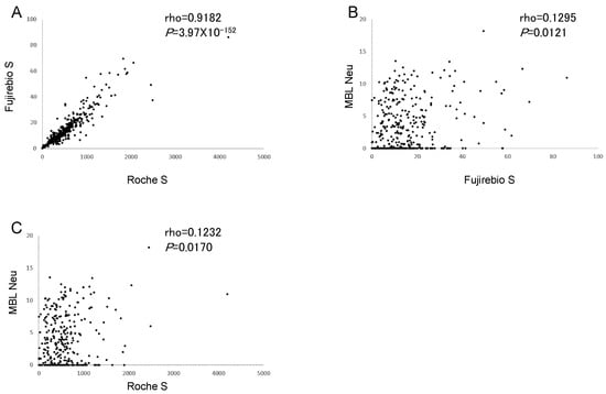 Correlations between results from the SARS-CoV-2 S Ab assays are shown in Figure 2. The Fujirebio S assay strongly correlated with Roche S (rho = 0.9182, p = 3.97 × 10−152), and both weakly correlated with MBL Neu (rho = 0.1295, p = 0.0121 and rho = 0.1232, respectively, p = 0.0170). These data confirm the strong correlation between Roche S and Fujirebio S assays.