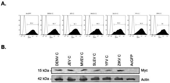 Recombinant lentiviruses encoding different myc-tagged flavivirus capsids and AcGFP were harvested from transfected HEK293T cells as described earlier by ourselves [35]. Transduction of A549 cells was performed in DMEM with 3% FBS and 5 μg/mL polybrene by spin inoculation (1200× g for 1 h at 37 °C).