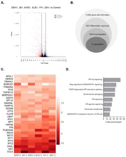 Global gene expression changes in capsid-expressing cells. A549 cells were transduced with lentiviral vectors expressing AcGFP alone or AcGFP and myc-tagged capsid proteins. Cells were collected at 48 h post-transduction, and then total RNA was extracted and processed for RNA-sequencing. Shown are the global gene expression changes common amongst all capsid-expressing cells relative to control (AcGFP). (A) Volcano plot displaying differentially expressed genes. Differentially expressed genes with >2-fold changes and with a p-value ≤ 0.01 are shown. Blue: upregulated; red: downregulated; grey: not significant. (B) Total common gene expression changes in capsid-expressing cells. All genes with a p-value of ≤ 0.01 are included. In total, 3621 genes were differentially expressed (>2-fold change). (C) Top 30 downregulated genes in cells transduced with flavivirus capsids. Each panel in the heat map represents a particular gene, and the intensity of the colour represents fold change relative to control (all values underwent log 10 transformation). (D) Gene ontology enrichment analysis of common differentially expressed genes (DEGs) among capsids. Biological pathways were determined by individually submitting DEG lists of downregulated genes to the online bioinformatics server (geneontology.org) using the annotation data set “Reactome pathways”. Shown are the top eight enriched pathways.