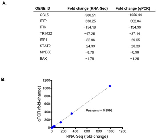 Validation of RNA-Sequencing. (A) Shown is the fold change of select genes that were generated from RNA-seq and qPCR for DENV capsid-expressing cells. (B) The fold-change obtained from RNA-Seq and qPCR were plotted with a line of best fit.