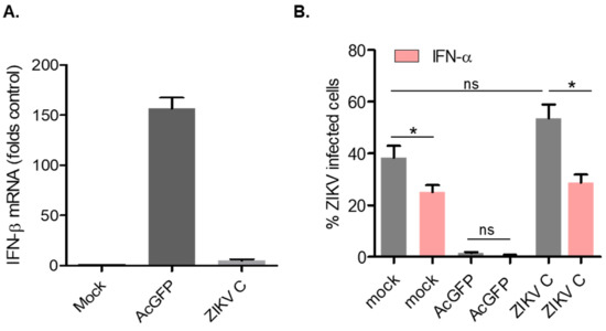 ZIKV capsid expressing cells suppress IFN-β and are highly susceptible to infection. A549 cells were transduced with lentivirus expressing AcGFP or AcGFP-Myc-ZIKVC (MOT of 10). (A) AcGFP expressing cells have high levels of IFN-β mRNA. Cells were collected at 48 h post-transduction and the levels of IFN-β mRNA in mock, AcGFP or ZIKV C-expressing cells were determined by qRT-PCR. (B) ZIKV C expressing cells are permissive to ZIKV infection but are sensitive to pre-treatment with IFN-α. Transduced cells were infected with ZIKV at an MOI of 3 (grey bars) or pre-treated with IFN-α prior to ZIKV infection (pink bars). All cells were collected 48 h post-infection and stained with anti-ZIKV NS1 antibody. Only the GFP-positive cells were included in the analysis. Average results from 3 independent experiments are shown. Results of statistical analyses (t-test) are indicated (* p ≤ 0.05). ns, not significant.