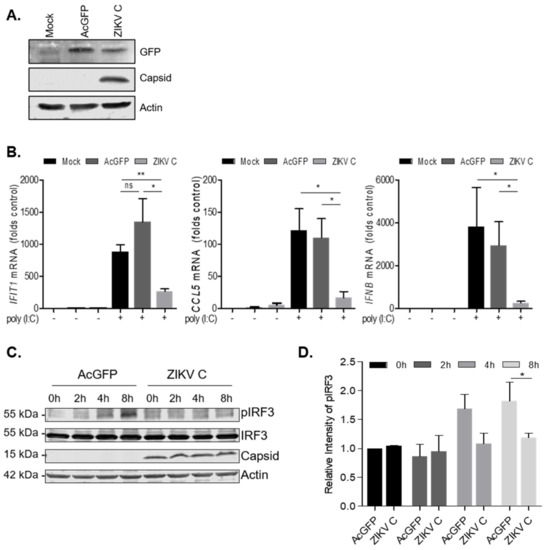 ZIKV capsid-expressing cells suppress IFN induction. (A) Immunoblot blot of GFP, ZIKV capsid and actin in cell lysates from AcGFP or AcGFP-ZIKV capsid-expressing stable cell lines. (B) Expression of select ISGs in AcGFP and ZIKV C-expressing cells. Cells were transfected with poly (I:C) for 24 h, total RNA was extracted and used to quantify IFIT1, CCL5, IFN-β gene expression by qRT-PCR. Shown are normalized values relative to mock cells (control). Data were from three independent experiments. (C) Time course of p-IRF3 in AcGFP or ZIKV C stables following poly (I:C) transfection. Western blot with antibodies that detect pIRF3, IRF3, ZIKV capsid, and actin are shown. (D). Mean relative intensity of Western blots based on three independent experiments. Results of statistical analyses (t-test) are indicated (* p ≤ 0.05) (**, p ≤ 0.01). ns, not significant.