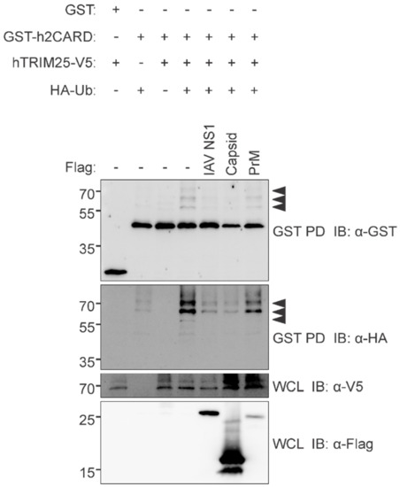 - Gack, M.U.; Shin, Y.C.; Joo, C.-H.; Urano, T.; Liang, C.; Sun, L.; Takeuchi, O.; Akira, S.; Chen, Z.; Inoue, S. TRIM25 RING-finger E3 ubiquitin ligase is essential for RIG-I-mediated antiviral activity. Nature 2007, 446, 916. [Google Scholar] [CrossRef]