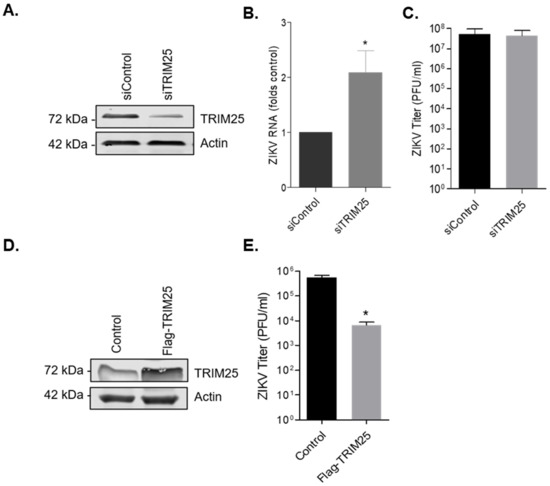 To further analyze the role of TRIM25 during ZIKV infection, we utilized dicer-substrate siRNA (DsiRNA) targeting TRIM25 (siTRIM25) or a non-targeting DsiRNA control (siControl). A549 cells were transfected with DsiRNAs for 48 h, after which cell lysates were analyzed for TRIM25 protein levels by immunoblotting (Figure 8A). On average, the level of TRIM25 protein was reduced by approximately 75% following siTRIM25 transfection. Next, cells were infected with ZIKV and 48 h later, total cellular RNA was extracted, and cell media were collected for qRT-PCR and viral plaque assays respectively. Reduction of TRIM25 expression resulted in a small (approximately 2-fold) but statistically significant increase in ZIKV replication, as determined by qRT-PCR using specific primers to ZIKV genomic RNA (Figure 8B), however, viral titers were not affected (Figure 8C). In contrast, ectopic expression of TRIM25 resulted in almost 100-fold drop in ZIKV titers (Figure 8D,E). These data indicate that TRIM25 is a restriction factor for ZIKV whose function may be abrogated by capsid-mediated sequestration during infection.