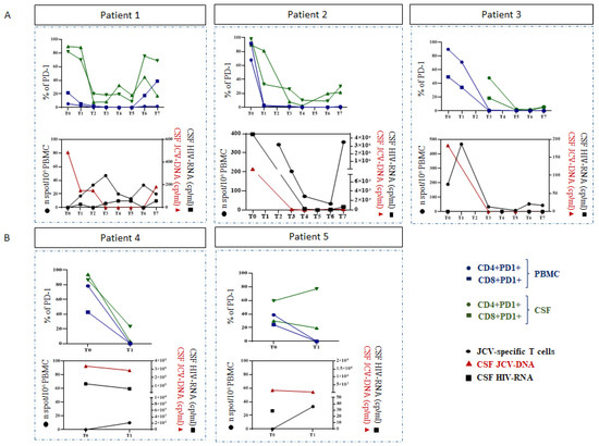 Frequency of circulating and CSF CD4 and CD8 expressing PD-1 was performed by multiparametric flow cytometry; JCV-specific T cell response, JCV-DNA decay and HIV-RNA decay in surviving (A) and dead (B) patients. JCV-specific T-cell response was performed by Elispot assay; JCV DNA and HIV RNA were tested by Real-Time PCR.