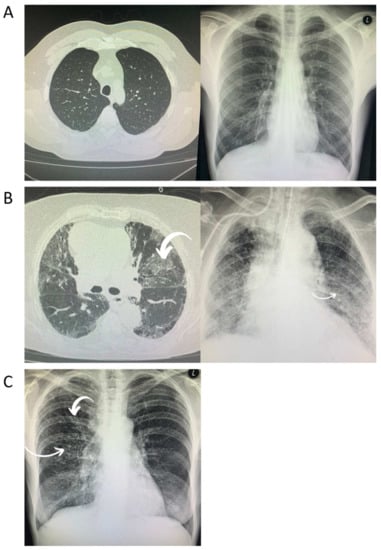 Bilateral consolidations that have a tendency toward the lungs’ periphery are usually found in CXRs and have an appearance that is most consistent with viral pneumonia. Chest CT images are most notable for showing bilateral and peripheral ground glass and consolidated opacities and are marked by an absence of concomitant pulmonary nodules, cavitation, adenopathy, or pleural effusions. These changes are considered typical for COVID-19 and may predict clinical deterioration [] (Figure 1A–C). The rapid recognition of which stage the patient is at and the deployment of the appropriate therapy will have the greatest benefit []. However, it is likely that immunocompromised patients, such as those who are HIV-positive, will have the same presentation for opportunistic infections such as P. jirovecii. In addition, they may present with many other types of opportunistic lung infection, such as mycobacteriosis diseases, which may hinder differential diagnosis and the choice of treatment during the course of COVID-19. As a result, patients co-infected with SARS-CoV-2 and HIV might be at higher risk of unfavorable outcomes.