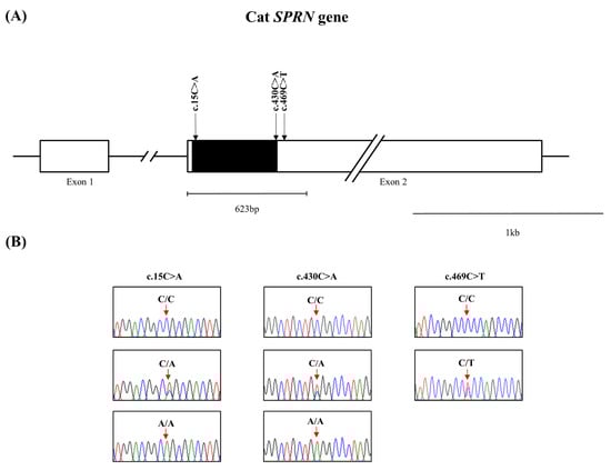 The feline SPRN gene (Gene ID: 102902356) was amplified from genomic DNA by polymerase chain reaction (PCR) using gene-specific primers (F: 5′-GCTGCGGTCCTTTCTCCGTT-3′, R: 5′-GCAGCGTCTGTGGGTCAG-3′). The PCR mixture was composed of 2.5 µL 10× H-star Taq reaction buffer, 5 µL 5× band helper, 1 µL dNTP mix (10 mM each dNTP), 1 µL of each primer (10 µM), 0.2 µL H-star Taq DNA polymerase (BIOFACT, Daejeon, Korea) and nuclease-free water up to a total volume of 25 µL. The PCR conditions were as follows: 98 °C for 15 min for denaturation; 40 cycles of 98 °C for 20 s, 60 °C for 40 s and 72 °C for 1 min for annealing and extension; and 1 cycle of 72 °C for 5 min for the final extension. PCR was performed using a C1000 Touch Thermal Cycler (Bio–Rad, Hercules, CA, USA). The PCR products (623 bp) were sequenced by an ABI 3730 sequencer (ABI, Forster City, CA, USA). Electropherograms of the sequencing data were produced by Finch TV software (Geospiza Inc., Seattle, WA, USA). The genotyping was performed with DNA sequences of the PCR products except for the primer region (585 bp).