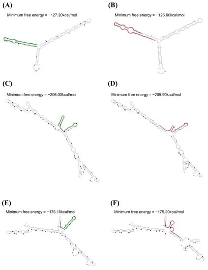 Analysis of the mRNA secondary structure of the feline SPRN gene according to haplotypes in the feline SPRN polymorphisms. (A) Minimum free energy and mRNA secondary structure of the feline SPRN gene with the CCC haplotype (1–215 nt). (B) Minimum free energy and mRNA secondary structure of the feline SPRN gene with the ACC haplotype (1–215 nt). (C) Minimum free energy and mRNA secondary structure of the feline SPRN gene with the CCC haplotype (230–580 nt). (D) Minimum free energy and mRNA secondary structure of the feline SPRN gene with the CAC haplotype (230–580 nt). (E) Minimum free energy and mRNA secondary structure of the feline SPRN gene with the CCC haplotype (269–580 nt). (F) Minimum free energy and mRNA secondary structure of the feline SPRN gene with the CCT haplotype (269–580 nt).