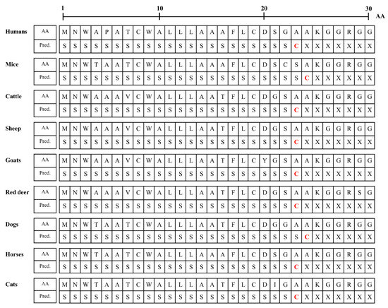 Signal peptide predictions of amino acid sequences of Sho protein in human, mouse, cattle, sheep, goats, red deer, dog, horse and cat. AA: amino acids; Pred.: prediction; S: signal peptide; C: cutting site; X: non-signal peptide.