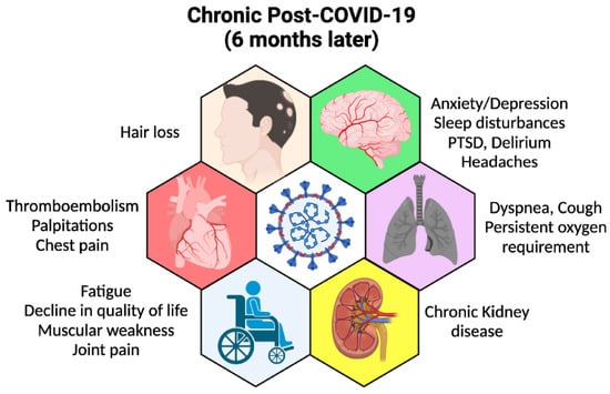 Long COVID-19 or post-acute sequelae. Schematic representation of persistent symptoms post-acute COVID-19. The figure was created using the BioRender.com website accessed on 15 March 2022.