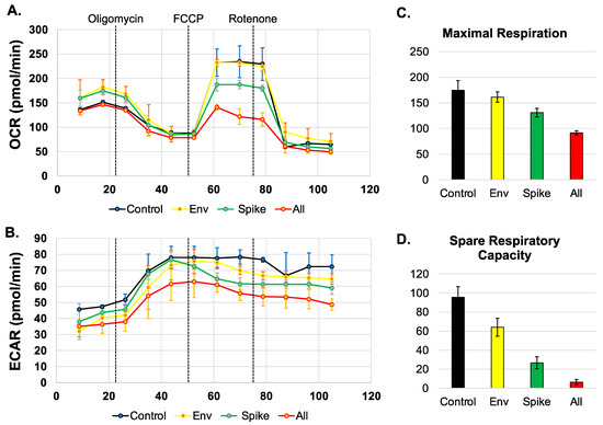 First, we sought to determine if SARS-CoV-2 proteins spike, envelope (Env), or all SARS-CoV-2 proteins except the membrane protein (All), disrupt mitochondrial oxygen consumption. We measured the oxygen consumption rate (OCR) (Figure 2A) and the extracellular acidification rate (ECAR) (Figure 2B) using a Seahorse Mito Stress Test. The spike protein but not the envelope protein was able to disrupt the oxygen consumption rate when compared to the control BEAS-2B cells (Figure 2A). In addition, the combination of all the proteins also led to the disruption of mitochondrial-associated oxygen consumption (yellow line) (Figure 2A). Furthermore, the BEAS-2B cells expressing all the SARS-CoV-2 proteins, and the cells expressing the spike protein alone decreased the OCR associated with maximal respiration. The decrease in OCR is representative of decreased ability of cellular respiration through the electron transport chain and ultimately decreased oxidative phosphorylation. Decreases in OCR are indicative of mitochondrial damage and reduced substrate availability to enter the TCA cycle [37]. In addition, the cells transfected with the combination of all the SARS-CoV-2 proteins and the spike protein also result in a decrease in the spare respiration capacity, when compared to the control untreated cells (Figure 2C,D). The spare respiration capacity is the difference between the capacities at maximum respiration and basal respiration. The decrease in spare respiration capacity also further indicates the lack of substrates to enter the TCA cycle [38].