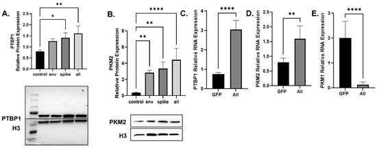 Decreased OCR indicates altered glycolysis and reduced pyruvate production [39]. Based on our observations and the literature, many viruses can alter the glycolysis pathway at the last step of glycolysis [40]. The last step is the conversion of phosphoenolpyruvate (PEP) into pyruvate and is performed by the pyruvate kinase enzyme, which has four isoforms including kinase muscle isoforms 1 and 2 (PKM1 and PKM2). PKM1 and PKM2 are the dominant isoforms of PKM that are found in most tissues [41]. The polypyrimidine tract-binding protein 1 (PTBP1) is important for splicing PKM into the PKM2 isoform over PKM1 [42,43]. Therefore, using BEAS-2B cells which produce a combination of all the SARS-CoV-2 DNA except the membrane protein, we determined the expression levels of PTBP1 and PKM2 proteins through a Western blot assay using anti-PTBP1 and -PKM2 antibodies. The production of SARS-CoV-2 proteins led to an increase in the expression of PTBP1 and PKM2 proteins (Figure 3A,B). The SARS-CoV-2 Env protein failed to affect the mitochondrial oxygen consumption rate (Figure 2A); however, it did upregulate the expression of both PTBP1 and PKM2 proteins (Figure 3A,B).