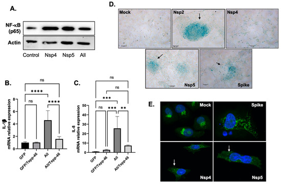 Persistence of Inflammation. (A). Expression of p65 subunit of NF-kB proteins isolated from untreated or BEAS-2B transfected as indicated by Western blot analysis. (B,C). mRNA expression of IL-1β and IL-8 as obtained by qPCR using BEAS-2B transfected then treated with 10 nM of Tepp-46 as indicated. Results were judged statistically significant by ANOVA (ns = not significant; ** p < 0.01; *** p < 0.001; **** p < 0.0001). (D), Nsp2, Nsp4 (modest), Nsp5, and the Spike proteins promote senescence in BEAS-2B as obtained using β-gal assay compared to the Mock untransfected control. (E). The addition of Nsp4 and NNsp5 to BEAS-2B causes a strong Golgi apparatus fragmentation compared to the Mock or the spike alone.