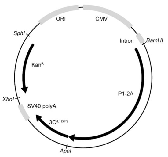 - Martel, E.; Forzono, E.; Kurker, R.; Clark, B.A.; Neilan, J.G.; Puckette, M. Effect of foot-and-mouth disease virus 3C protease B2 beta-strand proline mutagenesis on expression and processing of the P1 polypeptide using a plasmid expression vector. J. Gen. Virol. 2019, 100, 446–456. [Google Scholar] [CrossRef]
