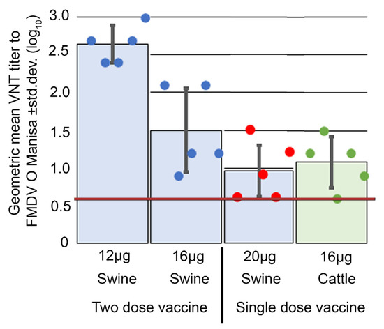 - Barrera, J.; Brake, D.A.; Schutta, C.; Ettyreddy, D.; Kamicker, B.J.; Rasmussen, M.V.; Bravo de Rueda, C.; Zurita, M.; Pisano, M.; Hurtle, W.; et al. Versatility of the adenovirus-vectored foot-and-mouth disease vaccine platform across multiple foot-and-mouth disease virus serotypes and topotypes using a vaccine dose representative of the AdtA24 conditionally licensed vaccine. Vaccine 2018, 36, 7345–7352. [Google Scholar] [CrossRef]