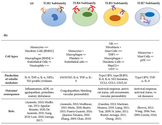 TLR response to DENV infection. Schematic drawing demonstrating the four different subfamilies of TLRs in different cells, production of soluble mediators and protective and/ or pathogenic outcomes. (a) Heterodimer and/or homodimer formation and its location on cell membrane and/or endosome. (b) Production of soluble mediators, expression in different cell types and protective and/or pathogenic outcomes of TLR subfamily activation during DENV infection [35,85,86,87,88,89,90,91,92,93,94,95,96,97,98,99,100,101,102,103,104,105,106,107]. +++ High expression, ++ intermediate expression, + low expression. Abbreviations: iNOS/NO—Inducible Nitric Oxide Synthase/Nitric Oxide; IL-6—Interleukin 6; IL-8—Interleukin 8; TNF-α—Tumor Necrosis Factor alpha; NETs—Neutrophil Extracellular Traps.