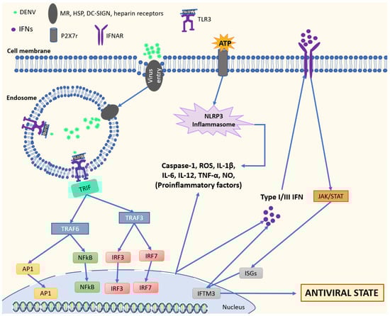 Antiviral state by activation of nucleic acid sensing by TLR3. TLR3 can recognize dsRNA as consequence of DENV infection. TLR3 activation stimulates production of proinflammatory factors and IFNs through transcription factors such as AP1, NFkB and IRF3/7. Activation of IFNAR by IFNs results in the transcription of hundreds of types IFN I and III and ISGs (via JAK/STAT) such as IFITM3 that promote IFN release in the endosomal compartment. During DENV infection, release of DAMPs and soluble mediators such as ATP and TNF-α are recognized by several cellular receptors such as P2X7r (ATP), triggering inflammasome assembly and activation. Consequently, capase-1, IL-1β, ROS and TFAM are produced and play roles in antiviral response and mitochondrial DNA releasement that may result in proinflammatory state and cytokine storm. Abbreviations: mannose receptor-MN, heat shock protein-HSP, dendritic cell-specific intercellu-lar adhesion molecule-3 grabbing non-integrin-DC-SIGN, interferon-induced transmembrane protein 3 -IFITM3, Interferon Stimulated Genes-ISGs, Tumor necrosis factor receptor-associated factor-TRAF, reactive oxygen species-ROS, interferon regulatory factor-IRF, TIR-domain-containing adaptor protein inducing interferon-β (IFNβ)-TRIF, transcription factor A mitochondria -TFAM.