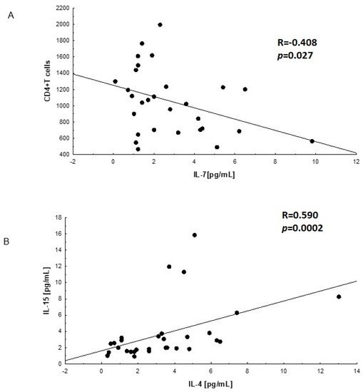 Correlations between interleukins. (A)—linear relationship between IL-7 concentration and the number of lymphocytes T CD4+ in plasma of HIV-infected men before cART; (B)—linear relationship between IL-4 and IL-15 in plasma of HIV-infected men after cART; the correlations were evaluated with Spearman’s non-parametric test.