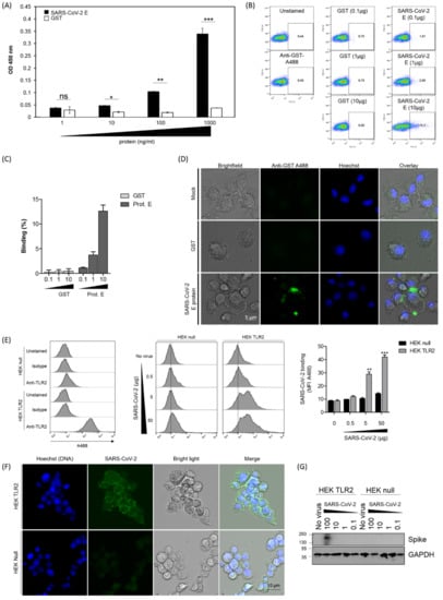 Binding of SARS-CoV-2 protein to human TLR2. (A) Soluble recombinant human TLR2 (100 µL at 1 µg/mL) was coated in 96-well plates. After saturation, various amounts of the E-GST protein (1 ng/mL–1000 ng/mL) were added for 2 h at 37 °C. TLR2 E-GST complexes were revealed by a solution of anti-GST sera follow by anti-anti-GST conjugated to HRP. (B) Primary human monocytes were incubated with 0.1 to 10 µg/mL of GST or GST-E SARS-CoV-2 protein. Cells were stained with anti-GST (1/1000). Data were acquired using a FACScalibur. One representative experiment is shown. (C) Quantification of the SARS-CoV-2 E protein or GST control binding to human monocytes from 3 different experiments acquired using a FACScalibur. (D) Primary human macrophages were incubated with 10 µg/mL of GST or GST-E SARS-CoV-2 protein. Cells were stained with anti-GST (1/500). Images were acquired using an EVOS M700 microscope. (E) HEK-TLR2 or HEK-null (106) cells were preincubated for 1 h with increasing amounts of inactivated SARS-CoV-2 (0.5–50 µg). The staining of SARS-CoV-2 complexes was performed with rabbit anti-spike antibodies used at 1/500 and donkey anti-rabbit IgG complexed with Alexa 488 used at 20 µg/mL. (F) HEK-TLR2 or HEK-null cells previously plated in 24-well plates were incubated for 1 h with various amounts of inactivated SARS-CoV-2 at RT. After 3 washes, binding of SARS-CoV-2 to HEK cells was evaluated by microscopy, and bound viral particles were detected by anti-spike antibodies. (G) HEK-TLR2 or HEK-null cells previously plated in 24-well plates were incubated for 1 h with various amounts of inactivated SARS-CoV-2 (0.1–100 µg) at RT. After washing and cell lysis, cell-associated viral particles were evaluated after SDS-PAGE and Western blotting using anti-spike antibodies. Statistical significance comparing different groups is denoted with * for p < 0.05, ** for p < 0.01 and *** for p < 0.001, while ns means non-significant.