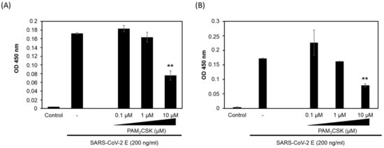 PAM2CSK4 and PAM3CSK4 interfere with SARS-CoV-2 E binding to TLR2. The specificity of E–TLR2 interaction was evaluated by testing the capacity of TLR2 ligands (A) PAM2CSK4 (0.1–10 µM) and (B) PAM3CSK4 (0.1–10 µM) to inhibit this interaction. Statistical significance comparing different groups is denoted with ** for p < 0.01.