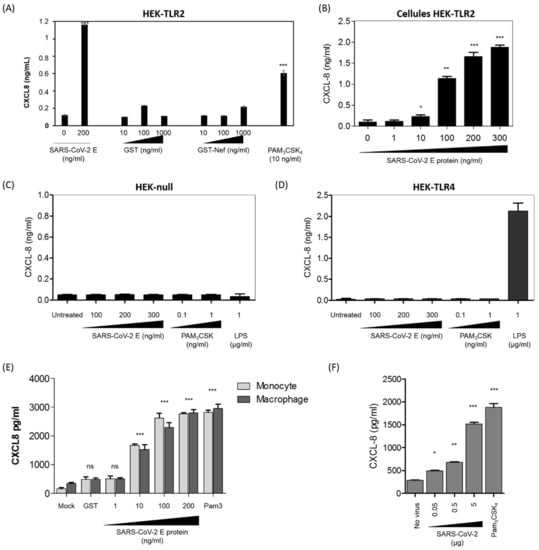 The E protein stimulates the production of the CXCL8 chemokine in a TLR2-dependent manner. (A) The HEK-TLR2 cell line was stimulated with the E protein (200 ng/mL), GST (10–1000 ng/mL), GST-Nef (10–1000 ng/mL) or PAM3CSK4 (10 ng/mL). CXCL8 chemokine production in the cell supernatants was quantified by ELISA. (B) Production of CXCL8 in cell supernatants of HEK-TLR2 cells stimulated by escalating concentrations of the E protein (1–300 ng/mL). (C,D) Production of CXCL8 in cell supernatants of HEK-null (C) and HEK-TLR4 (D) cell lines stimulated with the E protein (1–100 ng/mL) or with PAM3CSK4. (E) Primary human monocytes and macrophages were stimulated with the E protein (1–200 ng/mL). Stimulation with GST (200 ng/mL) or PAM3CSK4 (1000 ng/mL) was used as a negative and a positive control, respectively. After 20 h of treatment, the cell supernatant was collected and CXCL8 chemokine production in the cell supernatants was quantified by ELISA. (F) Primary human monocytes (106) were stimulated with an increasing amount (0.05 µg/mL–5 µg/mL—equivalent viral proteins present in the purified viral pellet) of β-propiolactone-inactivated SARS-CoV-2. Stimulation with PAM3CSK4 was used as a positive control. After 20 h of treatment, the cell supernatant was collected and CXCL8 chemokine production in the cell supernatants was quantified by ELISA. Statistical significance comparing different groups is denoted with * for p < 0.05, ** for p < 0.01 and *** for p < 0.001, while ns means non-significant.