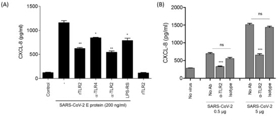 Inhibition of E-induced CXCL8 production by soluble recombinant TLR2 or by anti-TLR2 antibodies. (A) The HEK-TLR2 cell line was stimulated with the E protein (200 ng/mL) in the presence or absence of recombinant TLR2 (20 ng/mL), anti-TLR2 and anti-TLR4 antibodies or LPS-RS (10 µg/mL), and recombinant TLR2 (20 ng/mL) alone was used as a control. (B) HEK-TLR2 cells were stimulated with inactivated SARS-CoV-2 (0.5–5 µg/mL) in the presence of anti-TLR2 antibodies or their isotypes (10 µg/mL). After 20 h of treatment, the cell supernatant was collected and CXCL8 chemokine production in the cell supernatants was quantified by ELISA. Statistical significance comparing different groups is denoted with * for p < 0.05, ** for p < 0.01 and *** for p < 0.001, while ns means non-significant.