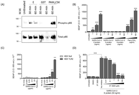 The E protein stimulates the activation of NF-kB. (A) HEK-TLR2 cells were stimulated with the E protein, GST or PAM3CSK4 for 30 or 60 min. Phosphorylation of P65 was analyzed by SDS-PAGE and Western blot by using specific anti-phospho-P65 (upper panel) or anti-total p65 antibodies (lower panel). (B) The HEK-TLR2 cell line, stably transfected with SEAP (secreted embryonic alkaline phosphatase), was treated with escalating concentrations of the envelope, spike or nucleocapsid protein or with PAM3CSK4 for 18 h, and SEAP activity was quantified in the cell supernatants. (C) HEK-blue TLR2 or HEK-blue null cells were stimulated with inactivated SARS-CoV-2 (0.025–25 µg) and analyzed at 45 min as described in Figure 1B. (D) The HEK-TLR2 cell line was treated with the envelope protein in the presence of an increasing amount of the MyD88 inhibitor ST 2825 for 18 h, and SEAP activity was quantified in the cell supernatants. Statistical significance comparing different groups is denoted with * for p < 0.05, ** for p < 0.01 and *** for p < 0.001, while ns means non-significant.