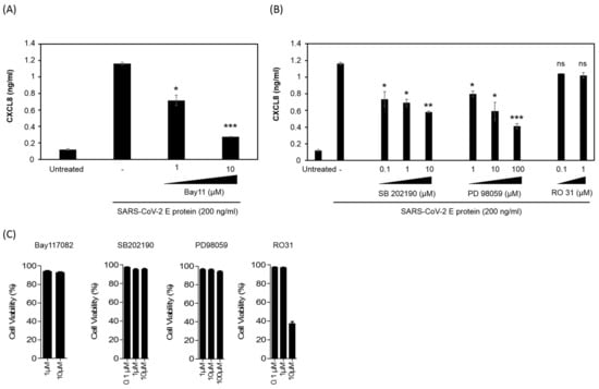 Inhibition of E-induced CXCL8 production by an NF-kB inhibitor but not by P38 and ERK1/2 MAP kinase and PKC inhibitors. (A) Inhibition of the E-induced CXCL8 chemokine in the presence of an NF-kB inhibitor. HEK-TLR2 cells were stimulated with the E protein (200 ng/mL) in the presence of the chemical inhibitor of NF-kB, Bay11, used at 1 and 10 µM. Production of CXCL8 in cell supernatants was quantified by ELISA. (B) HEK-TLR2 cells were pretreated with P38 MAP kinase inhibitor SB202190 (0.1–10 µM), ERK1/2 MAP kinase inhibitor PD 98059 (1–100 µM) or PKC inhibitor RO318220 (0.1–10 µM) for 1 h, before stimulation with the E protein (200 ng/mL). Produced CXCL8 in cell supernatants was quantified by ELISA. (C) The cytotoxicity of the used chemical inhibitors: SB202190, PD98059 and RO318220, was tested in a trypan blue exclusion assay at the used concentrations. Statistical significance comparing different groups is denoted with * for p < 0.05, ** for p < 0.01 and *** for p < 0.001, while ns means non-significant.