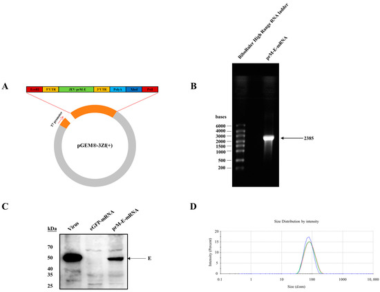 Construction and expression of mRNA-prM-E. (A) Characterization of vectors for in vitro transcription. (B) mRNA-prM-E was run in the 1% formaldehyde denaturing gel (RNase-free). (C) HEK-293T cells were transfected with the mRNA-prM-E, and lysate was analyzed by Western blotting with a monoclonal antibody 1H10 against the JEV E protein. The pcDNA3.1 plasmid encoding prM-E and JEV were used as the positive controls. (D) The particle size of the LNP-mRNA was measured three times using a Zetasizer spectrometer indicating an average size of approximately 80 nm.