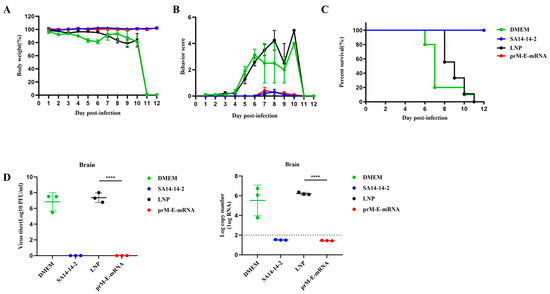 To assess the protective efficiency of the mRNA vaccine against JEV, the above four groups of mice were challenged with 1 × 106 PFU JEV P3 strains at 42 days after the first immunization. The results showed that vaccination with the mRNA vaccine and SA14-14-2 live-attenuated vaccine protected mice from weight loss and improved behavioral signs. However, a significant reduction in body weight and obvious clinical symptoms were observed in the DMEM and LNP group starting from day 5 post infection (Figure 3A,B). In total, 100% of mice immunized with prM-E-mRNA or SA14-14-2 survived, while the mice in LNP or DMEM control group all died within 11 days after the JEV challenge (Figure 3C). To further confirm the protective effect of the mRNA vaccine, the viral loads in the mice brains were measured. The results of a plaque assay and RT-qPCR indicated that no infectious virus and viral RNA were detected in the brain tissue of the mRNA vaccine- and attenuated vaccine-immunized mice on day 5 post-infection (Figure 3D). These results suggest an effectively protective activity of the mRNA vaccine against JEV.