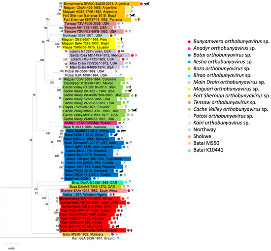 Phylogenetic tree of Bunyamwera serological group members based on L segment sequence (amino acid level). The tree was rooted to the genome of the La Crosse virus (EF485032). Alignments of amino acid sequences were performed using MEGA v.11 software using the MUSCLE algorithm. Phylogenetic trees were reconstructed using maximum-likelihood estimation based on the general time-reversible (GTR) parametric model allowing gamma-distributed frequency variation between sites and a proportion of invariant sites in the sequence. The robustness of the tree was tested using 1000 bootstrap replicates. The GTR substitution model evaluated 24 models with various combinations of parameters of nucleotide substitution on the basis of maximum-likelihood fits and selected the best model among them. Attribution to the orthobunyavirus species according to ICTV is indicated by a colored dot. The real attribution to the orthobunyavirus species is indicated by colored highlighting. Isolate source listed as an animal picture.