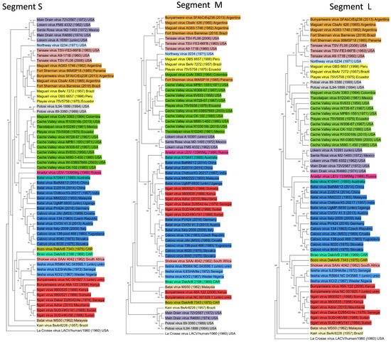 The trees were rooted to the genome of the La Crosse virus (EF485030-EF485032). The alignment of nucleotide sequences was performed with MEGA v.11 software using the MUSCLE algorithm. Phylogenetic trees were reconstructed using maximum-likelihood estimation based on the general time-reversible (GTR) parametric model allowing gamma-distributed frequency variation between sites and a proportion of invariant sites in the sequence. The robustness of the tree was tested using 1000 bootstrap replicates. The GTR substitution model evaluated 24 models with various combinations of parameters of nucleotide substitution on the basis of maximum-likelihood fits and selected the best model among them. The accession numbers for the nucleotide sequences of the L, M, and S segments of the Bunyamwera serological group members are provided in Table S1. Attribution to the orthobunyavirus species according to the ICTV is indicated by a colored dot. The real attribution to the orthobunyavirus species is indicated by colored highlighting.