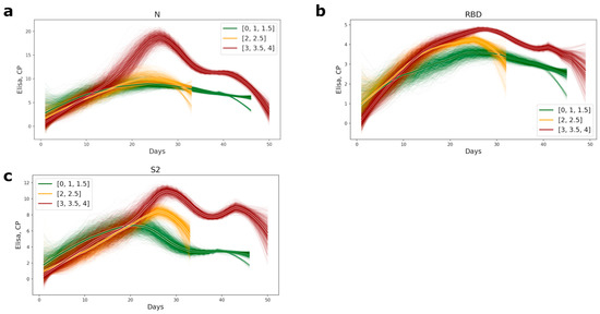 Plots of appearance of the antibodies to the conformational epitopes of N (a), RBD (b), and S2 (c) proteins in COVID-19 patients’ serum. The lines were computed as subsampled sliding windows with a window width of 0 and a subsampling size of 7. The bolder lines are the averages of approximations. The color of the lines represents the level of disease severity: the green lines, the mild course of disease (CT = 0–1.5); the yellow, the medium level of disease (CT = 2–2.5), and red, the most severe (CT = 3–4).