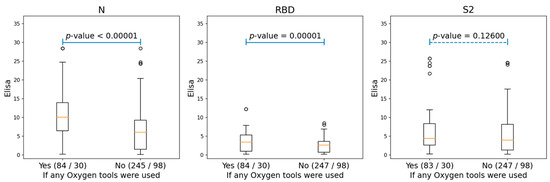 The boxplots, showing the differences for the ELISA values of N, RBD, and S2 proteins among the patients who needed oxygen support and those who did not. The ‘Yes’ group, indicating patients who used any oxygen tools (either nasal cannula or supplementary oxygen) and the ‘No’ group, consisting of patients without any oxygen tool interventions. The two numbers in braces for each group indicated the number of Elisa samples and patients correspondingly. The p-values were produced by performing ANOVA tests for each of the two groups.