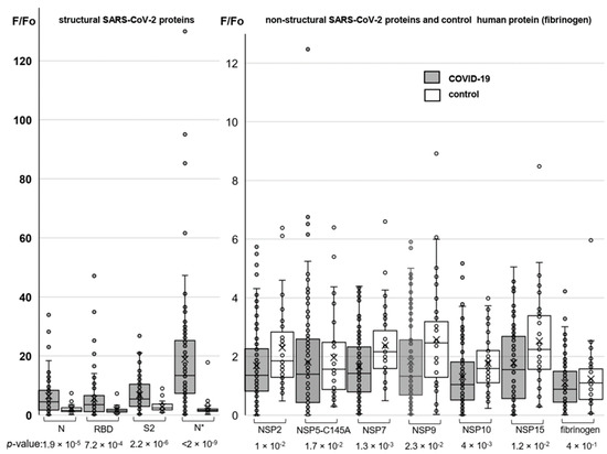 Profiling responses to the structural (left) and non-structural (right) SARS-CoV-2 proteins using protein microarrays. The box plots summarize the distributions of the relative levels of antibodies to particular proteins detected in COVID-19-positive donors (numbers of samples: 95 for SARS-CoV-2 proteins and 80 for fibrinogen) and the control group (numbers of samples: 37 for SARS-CoV-2 proteins and 34 for fibrinogen).
