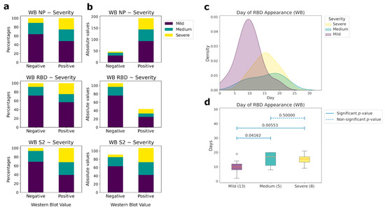 The timing of appearance of the antibodies of conformational epitopes to the NP, RBD, and S2 for the medium- and high-severity groups of patients was the same; all antibody values became positive within 14–16 days from the inception of the disease. Significant differences in antibody titer between the different severity groups of patients appeared after the 16th day of the disease (Figures S1–S3), and all antibody tests also became positive after this period. Patients with a mild course of the disease had generally lower antibody levels than the medium- and high-severity groups of patients (Figure 1). The most significant differences in antibody titer were observed for the nucleocapsid protein. In the group of high severity patients, the level of antibodies was 2.5-fold higher (Figure 1a and Figure S1).