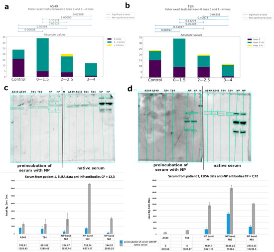 We investigated the putative autoimmunity effect of antibodies using A549 (lung adenocarcinoma) and T84 (colorectal carcinoma) eukaryotic cell lines because these tissues are among the main targets of the virus (Figure 5a,b and Figure 6). Considering that almost 82% of the studied patients had antibodies to the linear epitopes of NP and based on WB data, the observed cross-reactivity of antibodies was likely associated with this protein. We performed a competitive analysis by preincubation of the serum with NP and subsequent western blot analysis with eukaryotic proteins (Figure 5c,d). After such an anti-NP specific antibody elimination, cross-reactivity of the antibodies from the sera with eukaryotic proteins significantly decreased. However, binding of the sera from the control group with cell lysates was also detected. This may be due to the presence of antibodies to other prior coronavirus infections, especially given the high homology among the viral N protein [49], as well as due to possible latent autoimmune processes. The list of bands identified by mass-spectrometry is shown in Table 1.