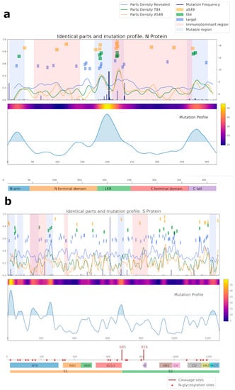 Analysis of the common regions between N (a), S (b) SARS-CoV-2, and human proteins. Proteins from the A549 cell line are shown in yellow; proteins from the T84 cell line are in green; our target protein, detected by mass-spectrometry as potentially capable of being recognized by IgG antibodies, is in blue. For cell lines, the intersection area was selected at 6 amino acids; for target proteins, it was selected at 4. Mutational and immunodominant profiles of proteins were taken from published data.