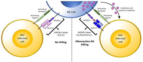 Several reports showed that HLA mismatches between transmission pairs decreased the risk of perinatal and sexual HIV transmission [106,107,108,109,110]. KIR/HLA genetic variation, particularly combinations having an activating KIR/HLA profile such as activating KIRs, a group B KIR haplotype, or inhibitory KIRs in the absence of their ligands were associated with protection from infection in HESN individuals [71,74,78,79,80,91,111]. Jennes et al. investigated the role of NK cells in HIV resistance in the seronegative partners of serodiscordant couples and susceptibility to HIV in seroconcordant couples [105]. They hypothesized that, in certain contexts, NK cells were activated by allogeneic HIV-infected cells to kill infected cells originating from their sexual partners [105]. They found that HIV transmission in heterosexual couples depended on the presence of NK cell educating KIR/HLA combinations in the recipient partner. If the transmitting partner expressed MHC class I allotypes that were not recognized by the recipient partner’s educated NK cells (i.e., were mismatched) they were less likely to seroconvert than if the transmitting partner expressed MHC class I antigens recognized by the recipient partner’s NK cells (i.e., were matched) (Figure 3).