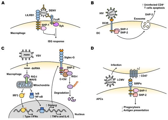 Viruses manipulate host inhibitory receptors for immune evasion. (A) Dengue viruses (DENV) opsonized with antibodies are taken up via Fcγ receptors (FcγR) on macrophages. By co-ligating LILRB1, DENV can inhibit FcγR signaling and IFN-stimulated gene (ISG) responses. (B) Human immunodeficiency virus (HIV) attaches to dendritic cells (DCs) via DCIR. HIV-pulsed DCs release more exosomes containing pro-apoptotic protein DAP-3, inducing apoptosis of neighboring uninfected CD4+ T lymphocytes. (C) RIG-I recognizes vesicular stomatitis virus (VSV) and induces Siglecg expression. The increased Siglec-G inhibits immune response by recruiting phosphatase SHP-2 and the E3 ubiquitin ligase c-Cbl to RIG-I, resulting in RIG-I degradation. (D) Cells infected with lymphocytic choriomeningitis virus (LCMV) have an upregulated expression of CD47, which mediates the “don’t eat me” signal by interacting with SIRPα. The CD47-SIRPα axis impairs phagocytosis and antigen-presenting capabilities in antigen-presenting cells (APCs).