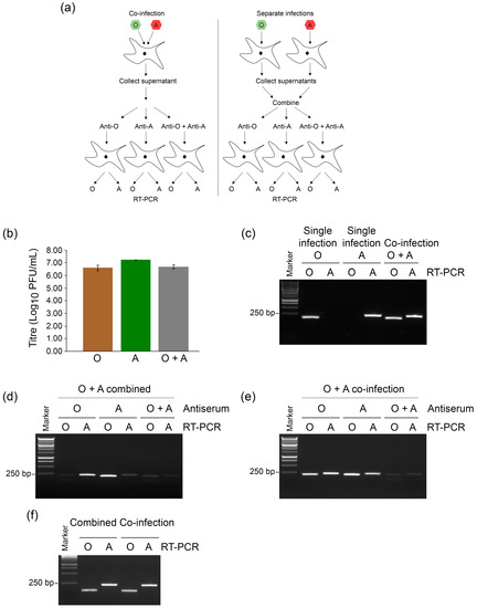 To confirm virus neutralization, we carried out simultaneous microscopic observation of cells to monitor the development of cytopathic effect (CPE). Infection of the cells with viruses obtained from the co-infection experiment produced complete CPE within 16 h in the absence of neutralizing antisera (Supplementary Figure S1). Pre-incubation with anti-O or anti-A antisera (individually) partially blocked the development of CPE, whereas no CPE was observed at 16 hpi in the cells that were infected with viruses pre-incubated with both anti-O and anti-A antisera. Of note, barely detectable background levels of RT-PCR products were observed and were possibly due to incomplete neutralization leading to a very low level of infection (Figure 2d,e).